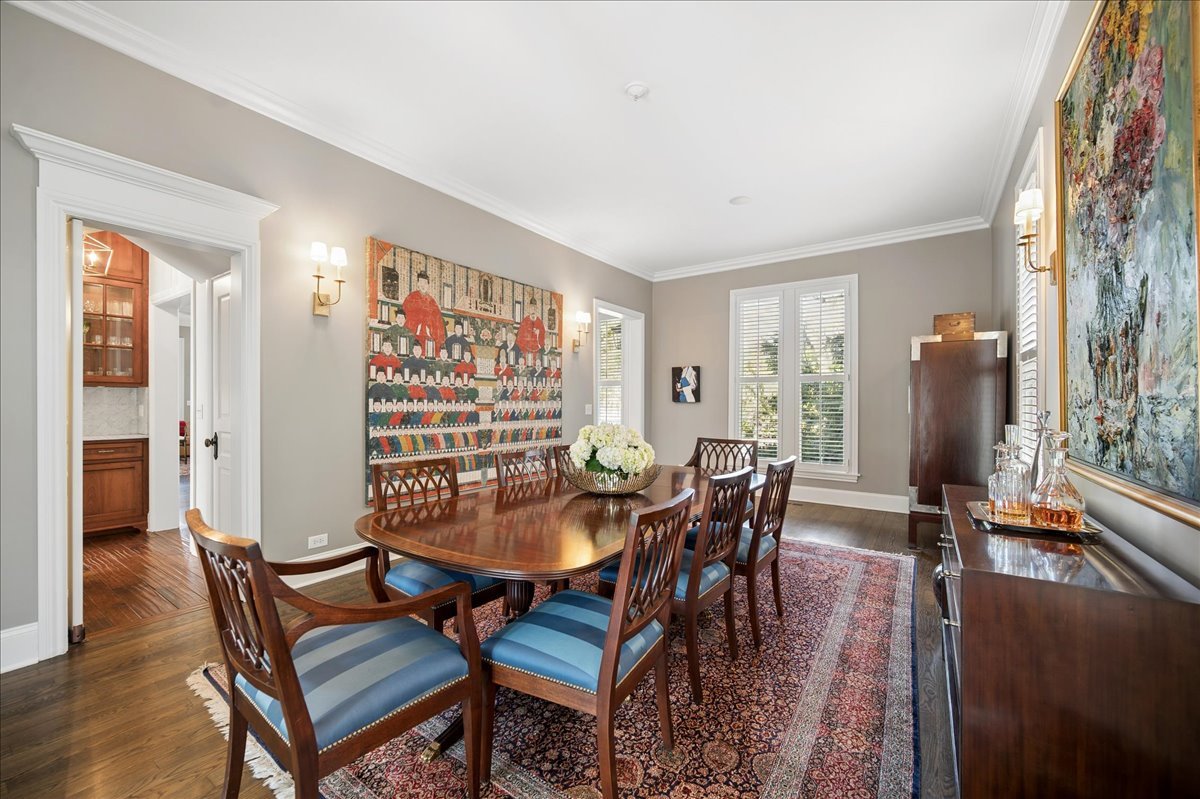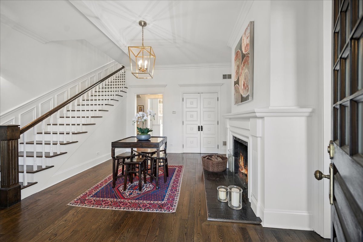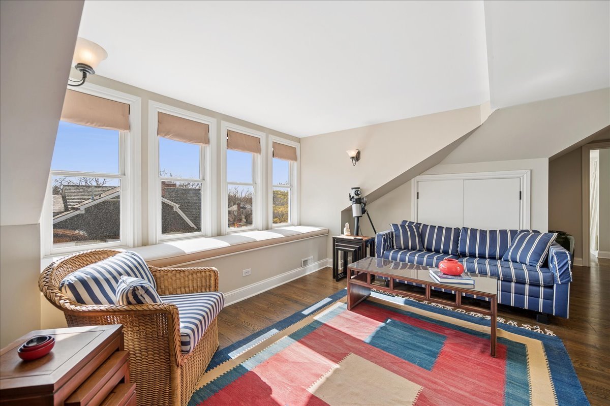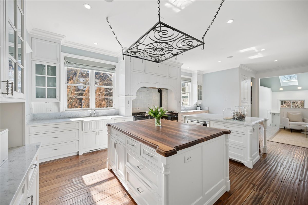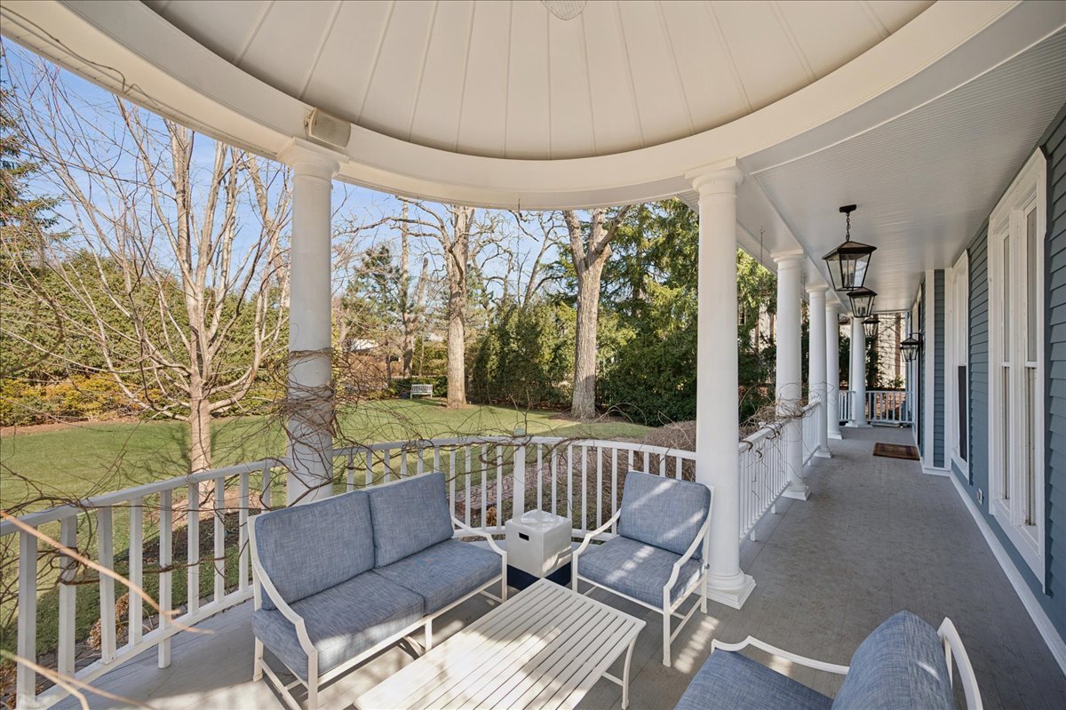 Set on a beautifully landscaped .33 acre property in one of Winnetka's most convenient locations, 875 Gordon Terrace is a significant historic home thoughtfully reimagined through a recent comprehensive renovation and expansion. An elegant wrought iron fence with intricate scrollwork encloses the property, and the sweeping wraparound covered porch immediately sets the tone. Double doors with beveled glass divided lights open to a spacious foyer with a gas fireplace. A stately staircase, paneled millwork, 10' ceilings and Visual Comfort lighting create a striking first impression. Large windows and a French door to the porch fill the living room with natural light and overlook the lovely landscaped grounds. A wood-burning fireplace makes it an easy place to gather. The banquet-sized dining room features generous windows, a built-in corner cupboard, and French doors that open to the sunroom/breakfast room. The kitchen is truly the heart of the home. Two substantial islands provide plenty of room for prep, seating, and conversation. A 6 foot Aga stove anchors the space, along with a Sub-Zero refrigerator, two refrigerator drawers, Bosch dishwasher, Dacor microwave, two disposals, and two full-sized sinks. Hand-scraped walnut floors run throughout, and a casual seating area centers around a corner wood-burning fireplace with Dutch tile surround. Just beyond are the family room and a sunroom with French doors leading to the private patio-an easy indoor-outdoor flow. A well-designed mudroom with slate floors is accessed from the attached 2.5-car garage and front yard, and a wall of cubbies and built-ins keeps everything organized. The second level offers four bedrooms and three full baths. The primary suite feels private and well-scaled, with a wood-burning fireplace, tray ceiling, and two large walk-in closets. The spa bath includes marble-topped vanities, a steam shower, and a whirlpool tub. Three additional bedrooms and two baths, one ensuite, complete this level. The third floor is brightened by a central skylight. A sitting room with a wall of windows and window seat creates a comfortable hangout space, along with two additional bedrooms and an updated hall bath. The lower level includes a dug-out rec room with a wall of built-in bookcases and storage below, a full bath with glass-enclosed shower, large storage closets, a laundry room, and three additional rooms for storage and utilities. All just steps from Hubbard Woods restaurants, shopping, the Metra, and schools.