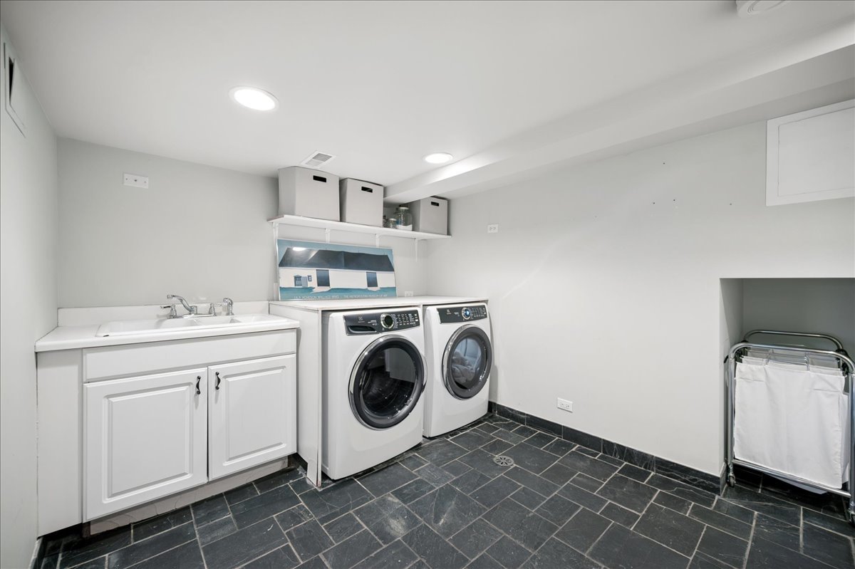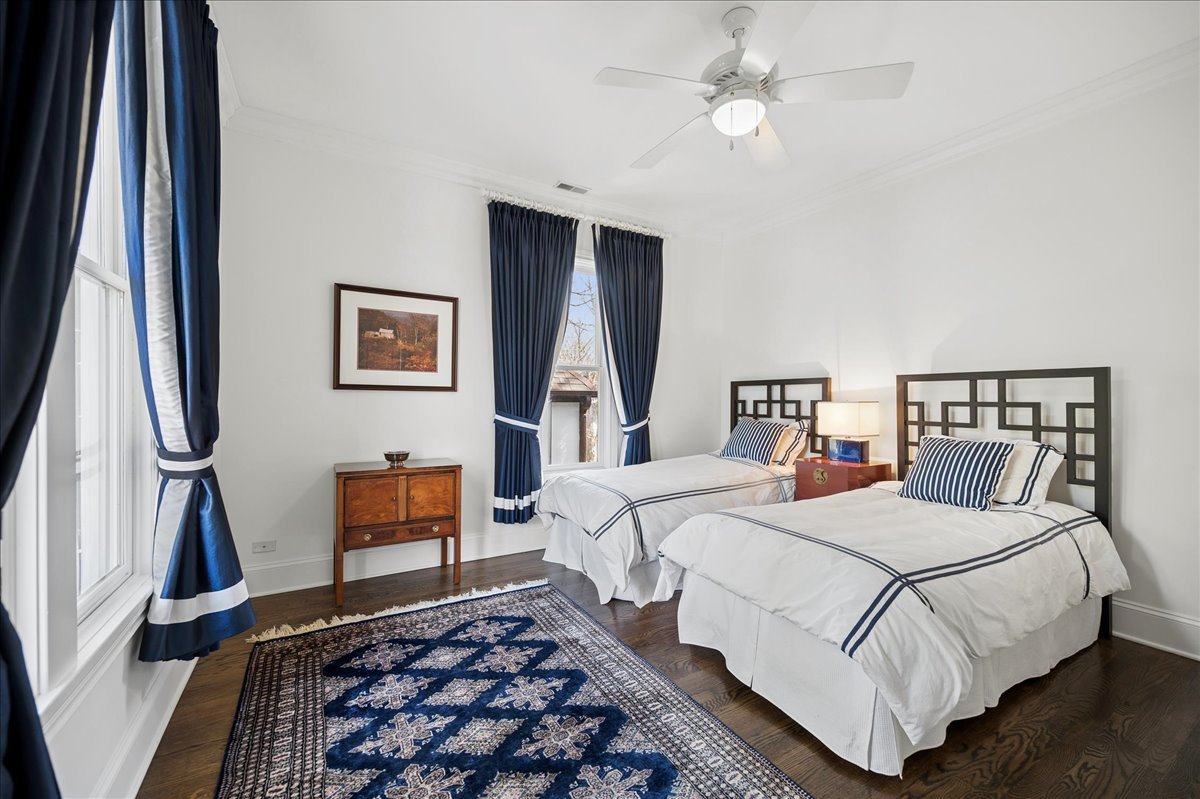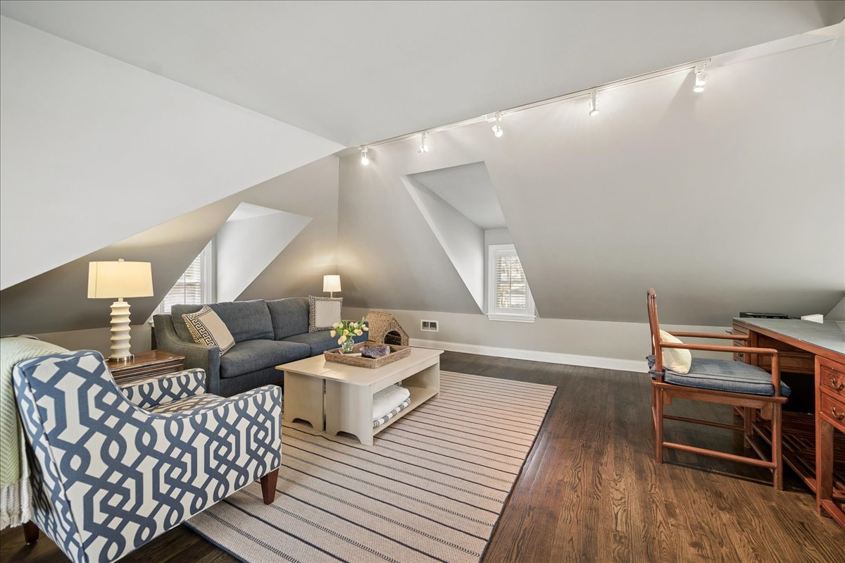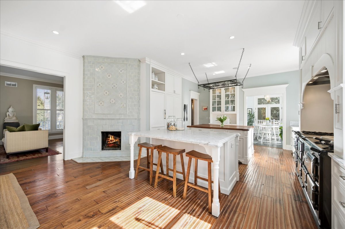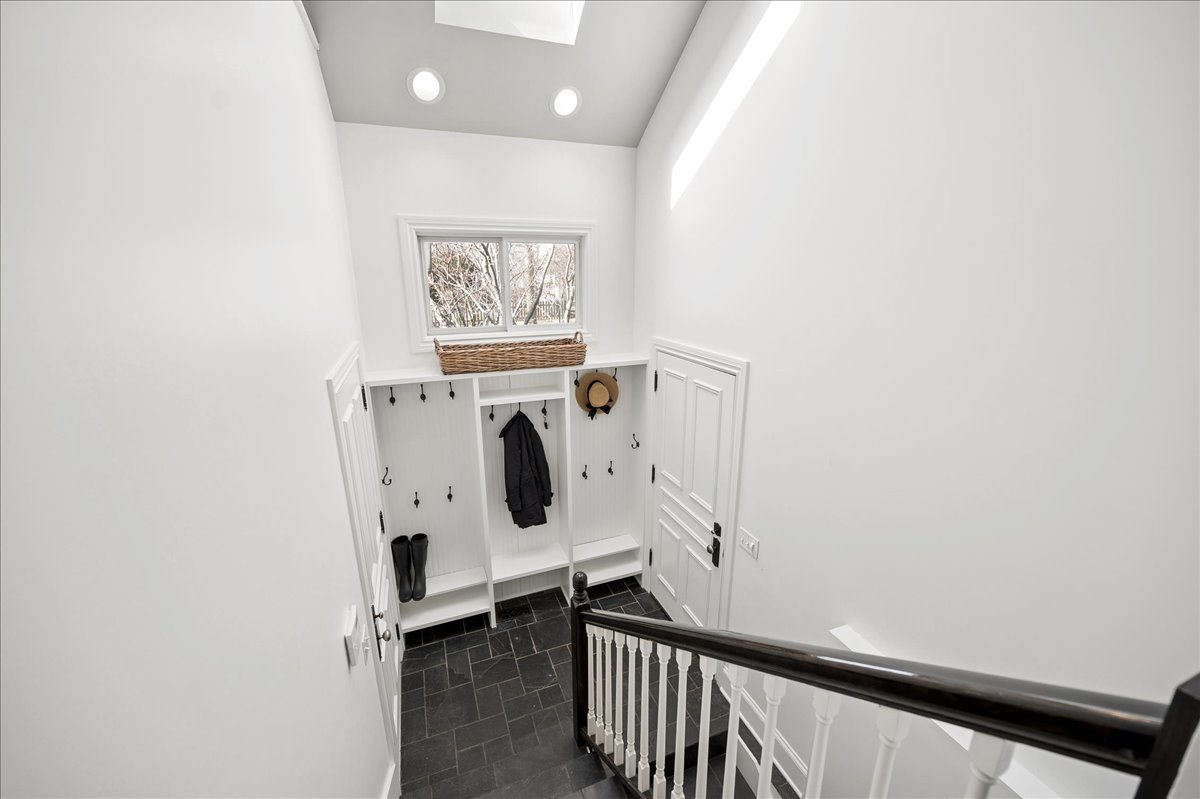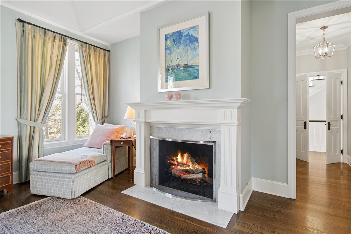 Set on a beautifully landscaped .33 acre property in one of Winnetka's most convenient locations, 875 Gordon Terrace is a significant historic home thoughtfully reimagined through a recent comprehensive renovation and expansion. An elegant wrought iron fence with intricate scrollwork encloses the property, and the sweeping wraparound covered porch immediately sets the tone. Double doors with beveled glass divided lights open to a spacious foyer with a gas fireplace. A stately staircase, paneled millwork, 10' ceilings and Visual Comfort lighting create a striking first impression. Large windows and a French door to the porch fill the living room with natural light and overlook the lovely landscaped grounds. A wood-burning fireplace makes it an easy place to gather. The banquet-sized dining room features generous windows, a built-in corner cupboard, and French doors that open to the sunroom/breakfast room. The kitchen is truly the heart of the home. Two substantial islands provide plenty of room for prep, seating, and conversation. A 6 foot Aga stove anchors the space, along with a Sub-Zero refrigerator, two refrigerator drawers, Bosch dishwasher, Dacor microwave, two disposals, and two full-sized sinks. Hand-scraped walnut floors run throughout, and a casual seating area centers around a corner wood-burning fireplace with Dutch tile surround. Just beyond are the family room and a sunroom with French doors leading to the private patio-an easy indoor-outdoor flow. A well-designed mudroom with slate floors is accessed from the attached 2.5-car garage and front yard, and a wall of cubbies and built-ins keeps everything organized. The second level offers four bedrooms and three full baths. The primary suite feels private and well-scaled, with a wood-burning fireplace, tray ceiling, and two large walk-in closets. The spa bath includes marble-topped vanities, a steam shower, and a whirlpool tub. Three additional bedrooms and two baths, one ensuite, complete this level. The third floor is brightened by a central skylight. A sitting room with a wall of windows and window seat creates a comfortable hangout space, along with two additional bedrooms and an updated hall bath. The lower level includes a dug-out rec room with a wall of built-in bookcases and storage below, a full bath with glass-enclosed shower, large storage closets, a laundry room, and three additional rooms for storage and utilities. All just steps from Hubbard Woods restaurants, shopping, the Metra, and schools.