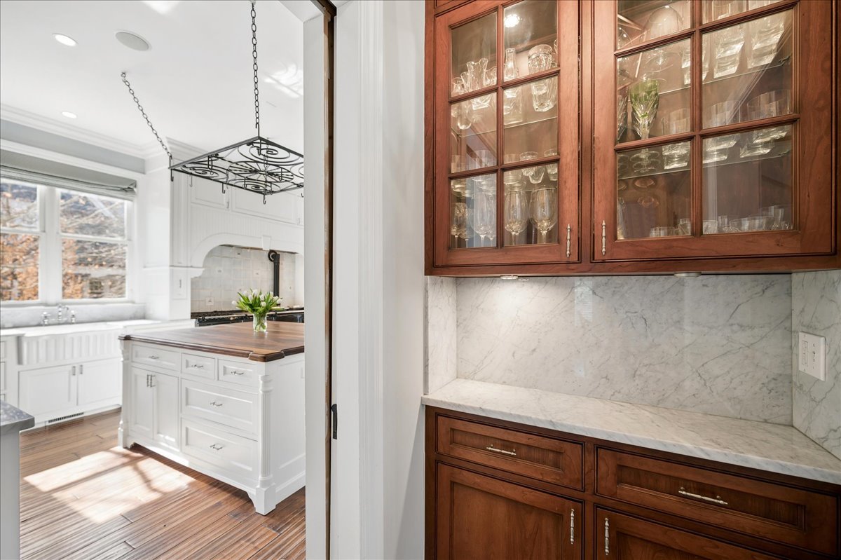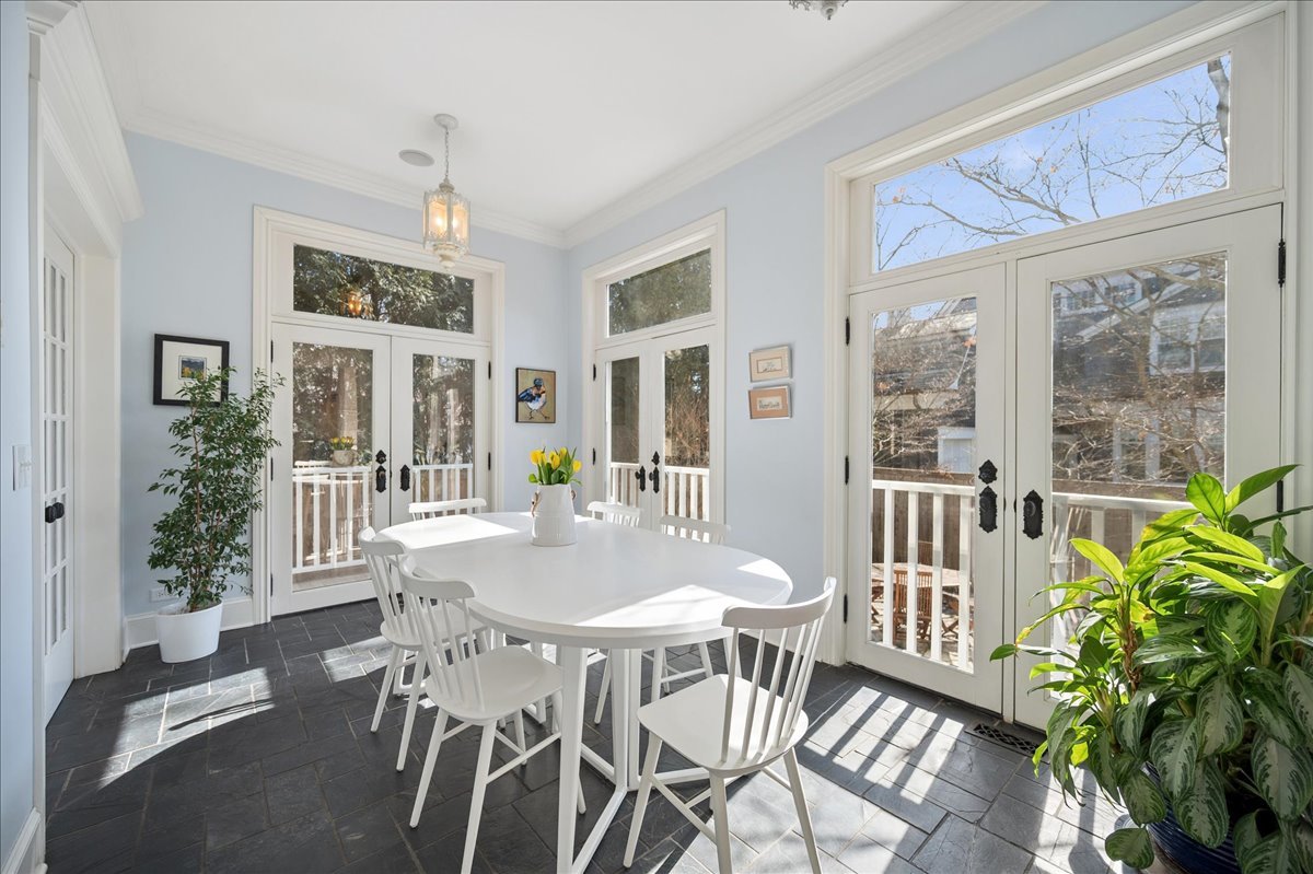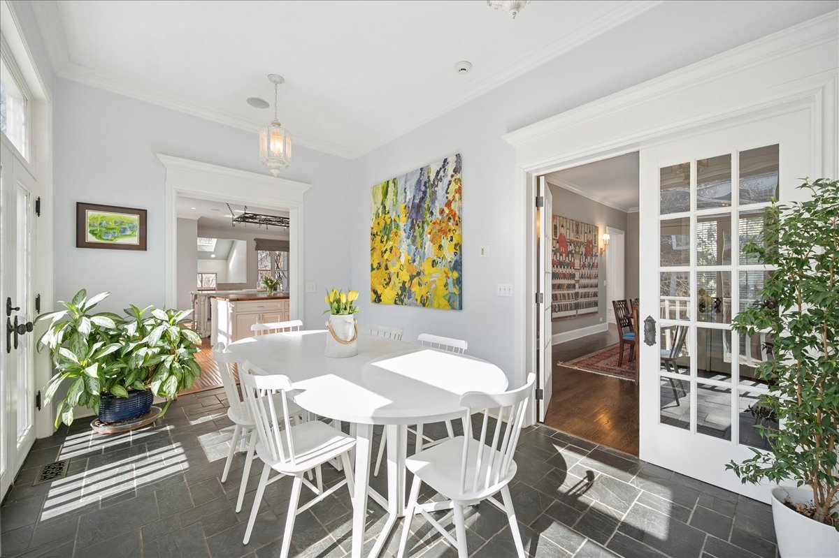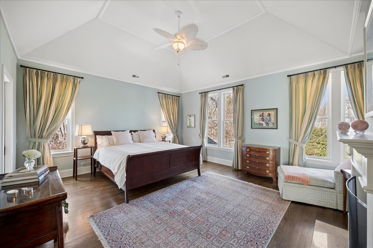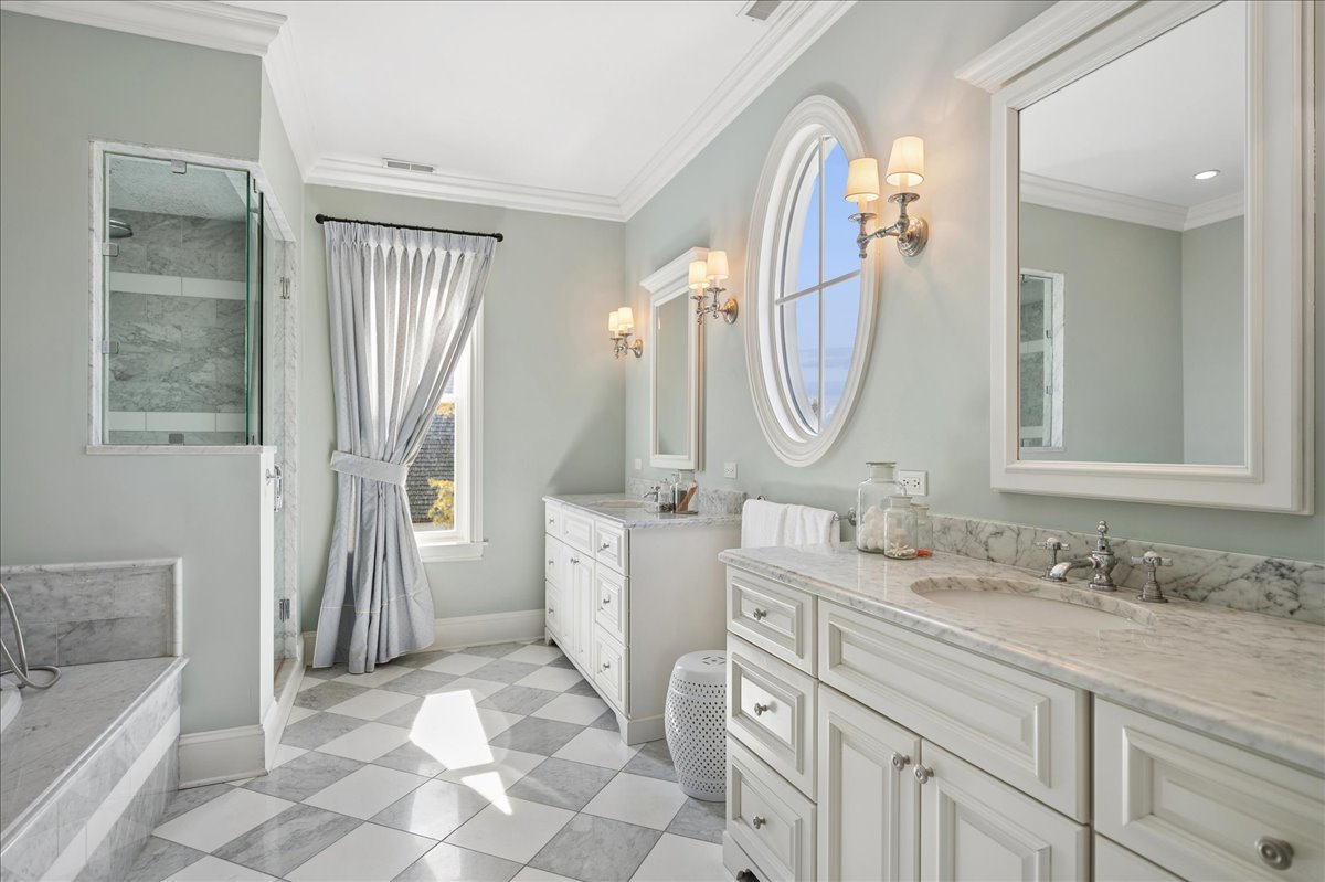 Set on a beautifully landscaped .33 acre property in one of Winnetka's most convenient locations, 875 Gordon Terrace is a significant historic home thoughtfully reimagined through a recent comprehensive renovation and expansion. An elegant wrought iron fence with intricate scrollwork encloses the property, and the sweeping wraparound covered porch immediately sets the tone. Double doors with beveled glass divided lights open to a spacious foyer with a gas fireplace. A stately staircase, paneled millwork, 10' ceilings and Visual Comfort lighting create a striking first impression. Large windows and a French door to the porch fill the living room with natural light and overlook the lovely landscaped grounds. A wood-burning fireplace makes it an easy place to gather. The banquet-sized dining room features generous windows, a built-in corner cupboard, and French doors that open to the sunroom/breakfast room. The kitchen is truly the heart of the home. Two substantial islands provide plenty of room for prep, seating, and conversation. A 6 foot Aga stove anchors the space, along with a Sub-Zero refrigerator, two refrigerator drawers, Bosch dishwasher, Dacor microwave, two disposals, and two full-sized sinks. Hand-scraped walnut floors run throughout, and a casual seating area centers around a corner wood-burning fireplace with Dutch tile surround. Just beyond are the family room and a sunroom with French doors leading to the private patio-an easy indoor-outdoor flow. A well-designed mudroom with slate floors is accessed from the attached 2.5-car garage and front yard, and a wall of cubbies and built-ins keeps everything organized. The second level offers four bedrooms and three full baths. The primary suite feels private and well-scaled, with a wood-burning fireplace, tray ceiling, and two large walk-in closets. The spa bath includes marble-topped vanities, a steam shower, and a whirlpool tub. Three additional bedrooms and two baths, one ensuite, complete this level. The third floor is brightened by a central skylight. A sitting room with a wall of windows and window seat creates a comfortable hangout space, along with two additional bedrooms and an updated hall bath. The lower level includes a dug-out rec room with a wall of built-in bookcases and storage below, a full bath with glass-enclosed shower, large storage closets, a laundry room, and three additional rooms for storage and utilities. All just steps from Hubbard Woods restaurants, shopping, the Metra, and schools.